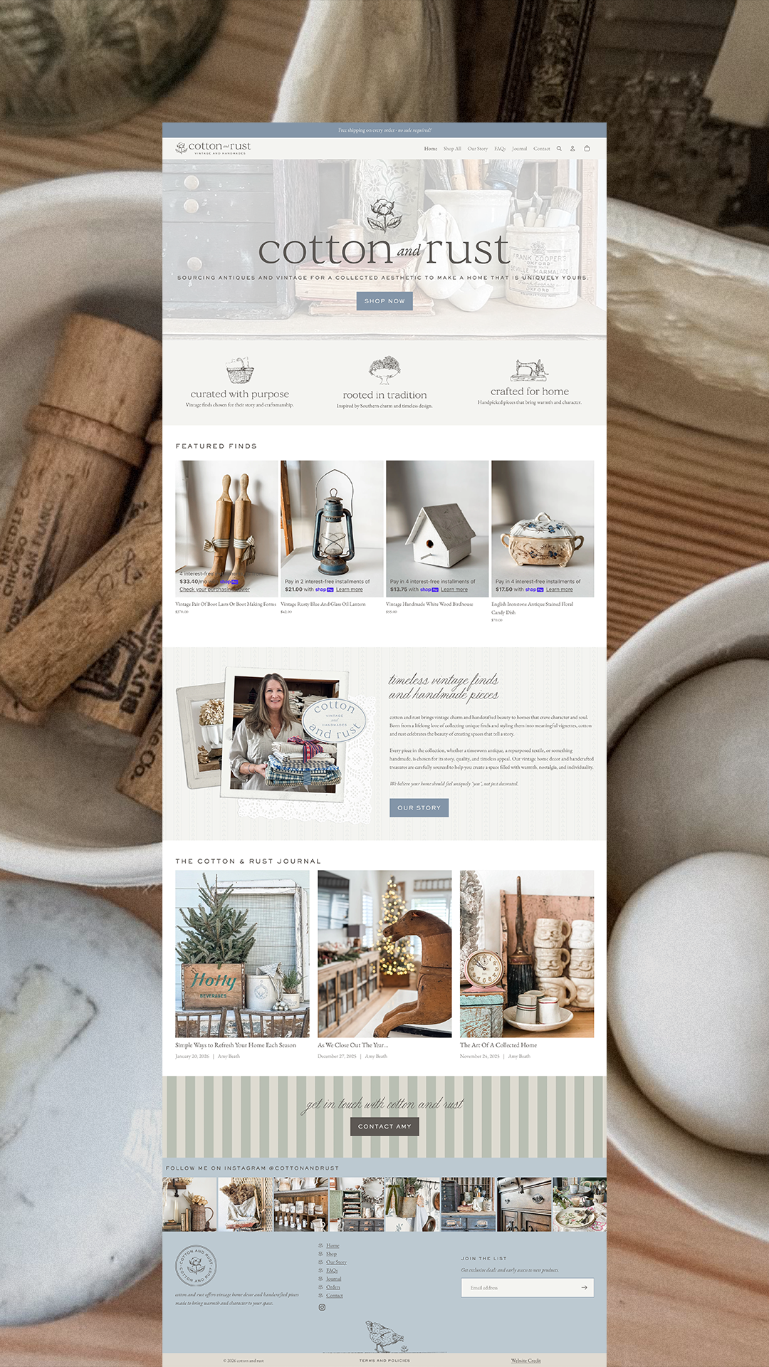 For Cotton and Rust, I led a full brand identity and Shopify e commerce website designed to feel collected, timeless, and quietly charming. The branding blends refined typography with hand drawn details, vintage inspired marks, and soft, heritage color palettes to reflect the heart behind the shop: thoughtfully sourced antiques and handmade pieces meant to tell a story. From custom logo variations and stamp style assets to pattern design and supporting illustrations, every element was built to feel warm, nostalgic, and cohesive. The Shopify website was designed to feel welcoming while still being highly functional, making it easy for customers to browse, shop, and connect with the brand’s story. The result is a polished yet approachable online presence that feels rooted in tradition while supporting modern e commerce growth.